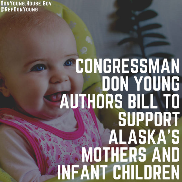 Congressman Don Young Introduces Legislation to Support Low-Income Mothers, Children Washington, July 17, 2019 | Washington, D.C. – Today, Alaska Congressman Don Young introduced the INFANT Act – legislation to remove an unnecessary rule that limits the number of foods eligible to purchase under the Women, Infants, and Children (WIC) Supplemental Nutrition Program. Current WIC policy prohibits certain food combinations from being purchased under the program. The INFANT Act eliminates these unnecessary guidelines and allows mothers and children receiving WIC assistance to purchase healthier and more nutritious foods. “As a former elementary school teacher, I know first-hand how important good nutrition is to a child’s ability to grow and reach their full potential,” said Congressman Young. “Countless families depend on the WIC program to keep their...