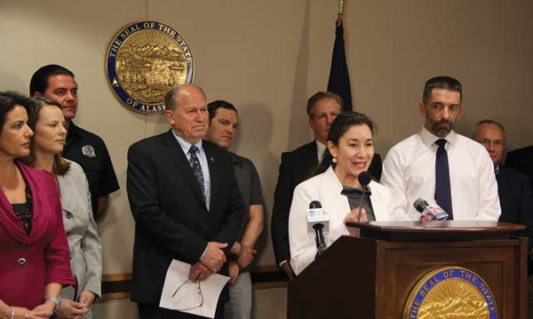 Bambino’s Baby Foods founder Zoi Maroudas speaks at a press conference June 6 in the Atwood Building in Anchorage alongside Gov. Bill Walker and other members of the state delegation that traveled to China in May to explore new trade possibilities.