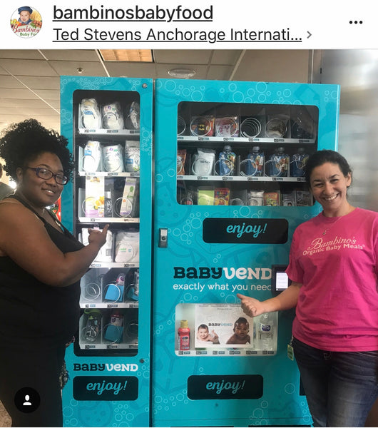 Bambino's Baby Food Partners with Baby Vend Our founder Zoi Maroudas partners with Baby Vend a woman owned company to help traveling parents have access to fresh organic foods while traveling. Traveling with little ones just became less stressful. Bambino’s Baby Food and Baby Vend partner together to address both nutritional and oops baby needs! This is so exciting!! Meet Jasmin Smith founder of Baby Vend together with our founder Zoi Maroudas setting up the very 1st machine. These vending machines are currently available in select Alaska Airline terminals. More great news coming soon!!! ✈️ 👶 💕A beautiful variety of Bambino’s Baby Food products will be available in vending machines - Nutrient rich organic snacks, cereals, bibs, bottles, soothing teas and gift...
