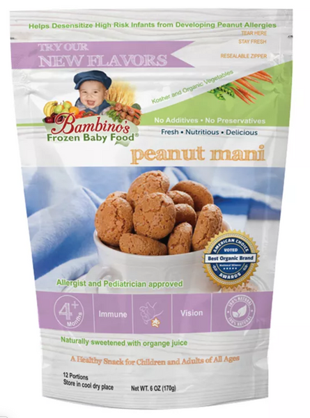Bambinos Baby Food is known for its peanut allergy prevention cookie. The Peanut Mani cookie, has the exact daily amount of natural peanut protein to help desensitize infants from ever developing the peanut allergy and has the success rate of 85%.