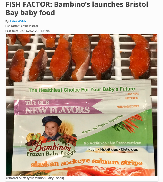 FISH FACTOR: Bambino’s Baby Food launches Bristol Bay baby food By: Laine Welch Fish Factor/For the Alaska Journal Commerce Bambino’s is filling a void by America’s baby food makers who continue to completely snub seafood in their protein lines, despite its proven health benefits (they offer seafood items in Asia and Europe). And that is despite the fact that starting in 2021, new federal dietary guidelines go into effect that say along with eating two portions of seafood each week, fish should be included in babies’ diets starting at six months old. “The omega-3s found in seafood are to a developing retina and brain what calcium is to bones. But it is not just the omega-3s, it is these...
